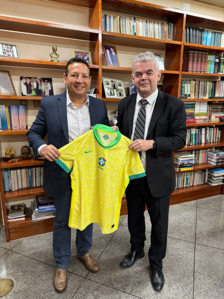 Durante a visita, Roberto Góes presenteou as autoridades com camisas oficiais da Seleção Brasileira e destacou a importância do trabalho integrado entre os poderes.